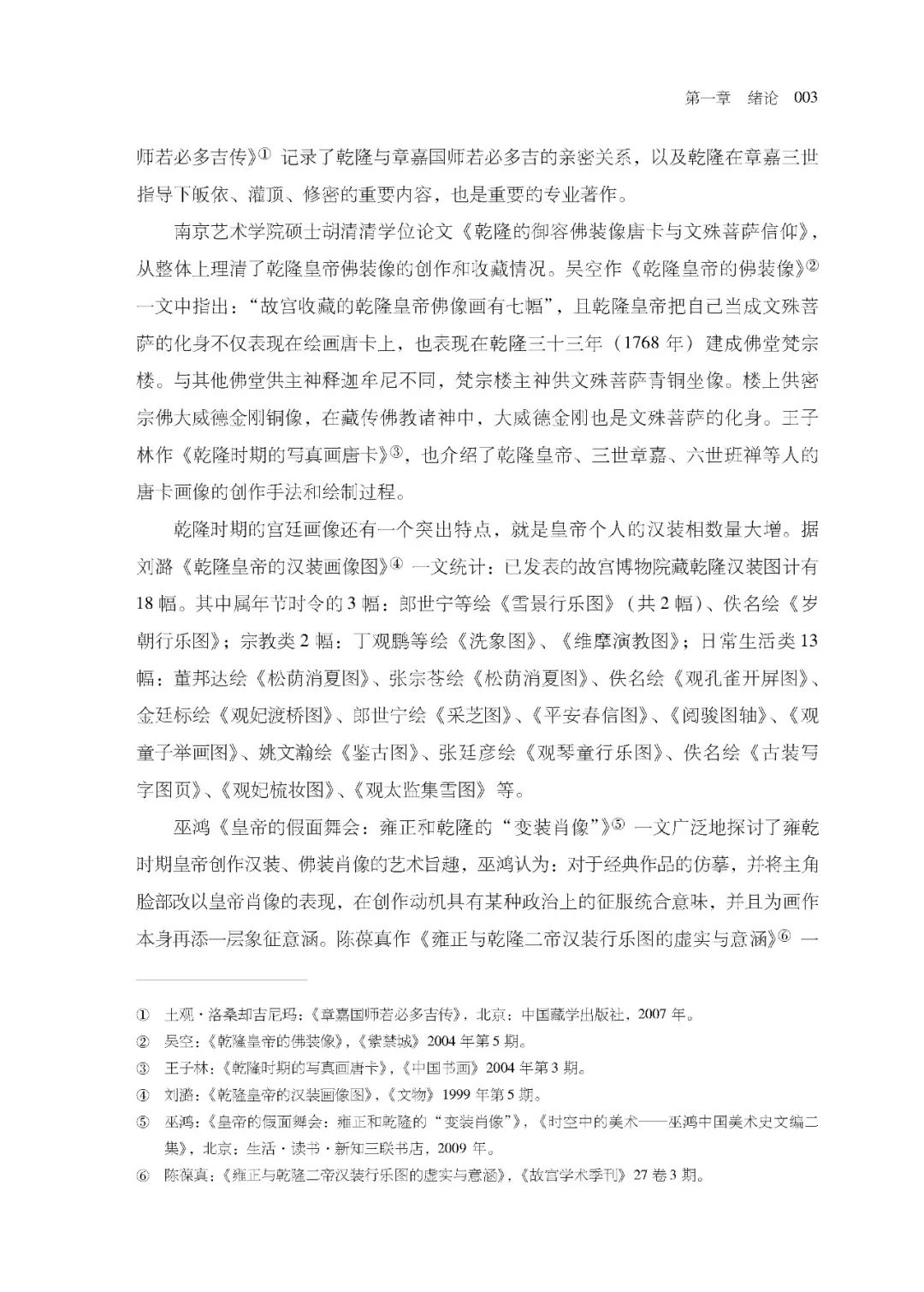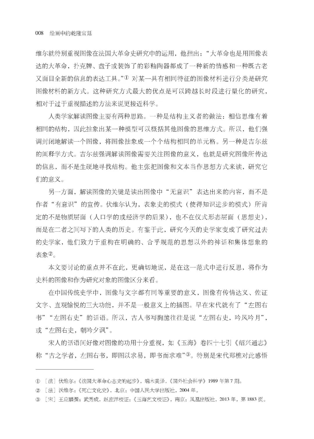 本书以乾隆朝宫廷史为范围,研究了在此领域内对应的绘画作品。从乾隆皇帝作为表现结果的肖像画、乾隆皇帝在南巡中对名画的收集和赏析活动、乾隆朝西洋画师的宫廷活动、乾隆皇帝及皇六子永瑢的书画交往活动、乾隆皇帝仿画作品、乾隆时期绘画与园林等方面,以图像史料入手,将其置入到整个史料序列中,和文字史料统一排列应用,以探究历史研究方法在图像史学发展中的具体实现方式。